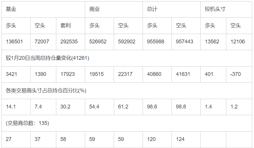 截止1月27日当周洲际交易所(欧洲)原油期货和期权分类持仓报告:       合约单位:(1000桶的合同)总持仓量:969550