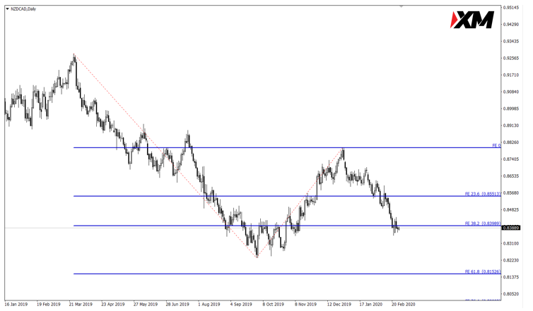 从大趋势的角度进行分析 目前的型态适合以扩展线执行交易 早在先前2/20收盘后价格跌破支撑0.8390 当时即成立了空单入场讯号 一直到今天为止价格始终上不去 持续在0.8390附近周旋 这里就提供了良好的入场机会 如要入场的交易原可以把0.8153作为止盈 止损条件以上涨突破0.8552为准