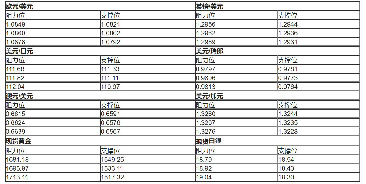 本文提供美元指数、欧元、英镑、日元、瑞郎、澳元、加元及黄金支撑阻力位。