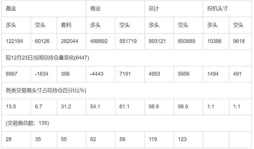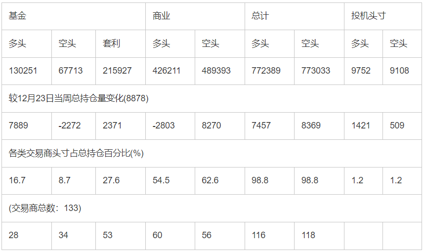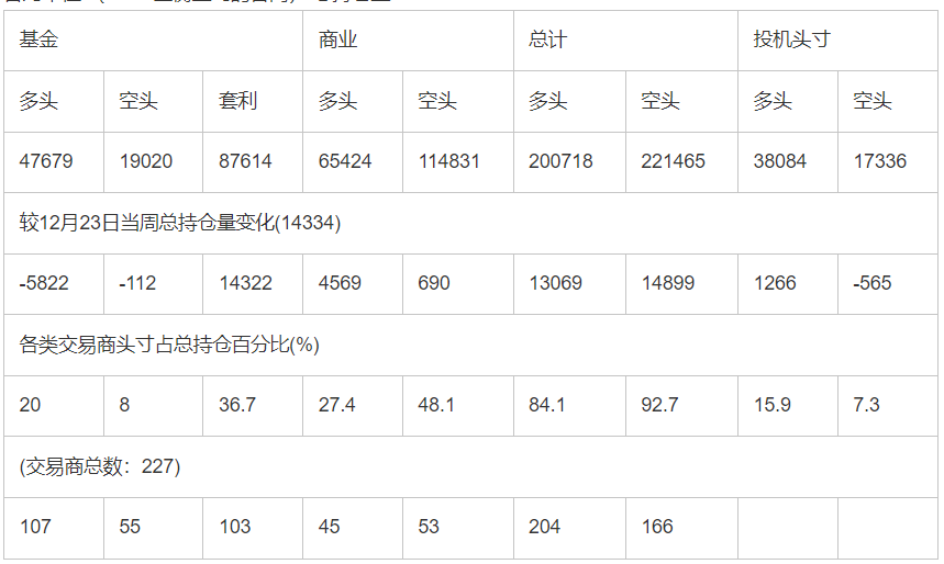 截止12月30日当周COX(纽约商品期货交易所)白银期货和期权分类持仓报告: 合约单位:(5000金衡盎司的合同)总持仓量:238801