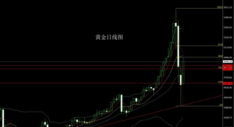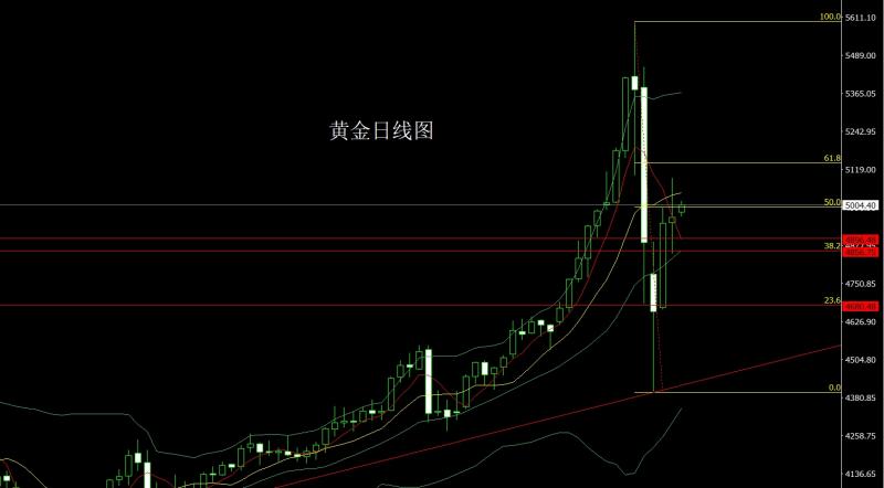 昨日黄金市场延续拉升趋势,早盘开盘在4673.4的位置后行情先回落给出4663.7的位置后行情强势震荡拉升,日线最高触及到了4995.1的位置后整理,日线最终收线在了4946.3的位置后,日线以一根上影线较长的大阳线收线,而这样的形态收尾后,今日的行情回踩延续多,点位上,前日4400的多减仓后止损上移放到4500,