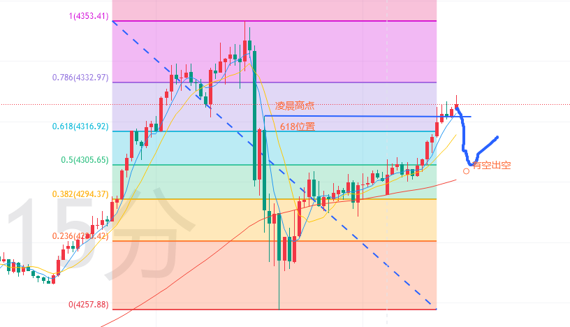 早安,屏幕前的你,在不懂的市场里拿懂的思维去搞钱,结果还是会被搞,任何市场,进之前都要去研究研究市场的属性,不是听一句,就能一直撞大运! 黄金方面,早间开盘上升。打破了两个点: 1,618位置4318,震荡的原则就是围绕618必做。 2,凌晨下跌的次高点,43