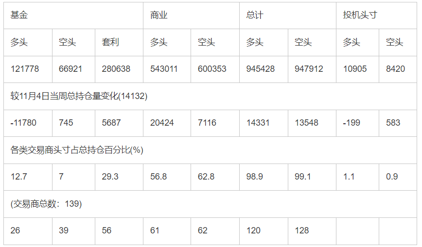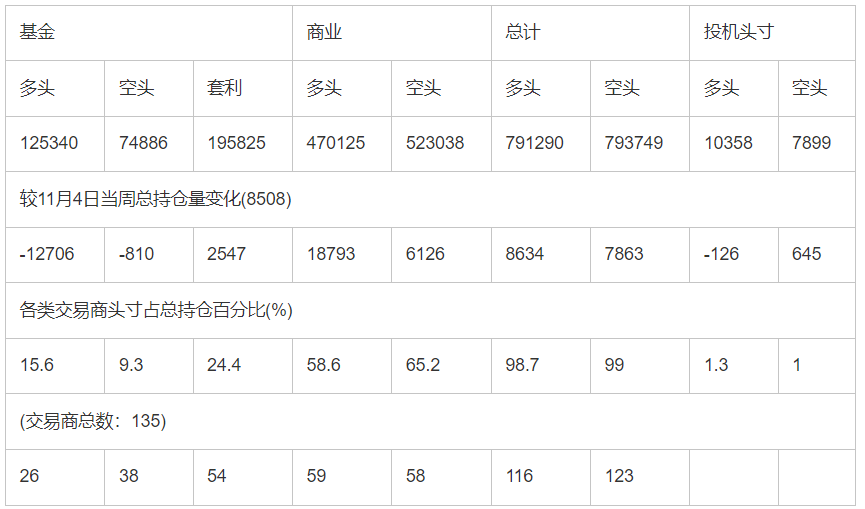 截止11月10日当周洲际交易所(欧洲)原油期货分类持仓报告: 合约单位:(1000桶的合同)总持仓量:801648