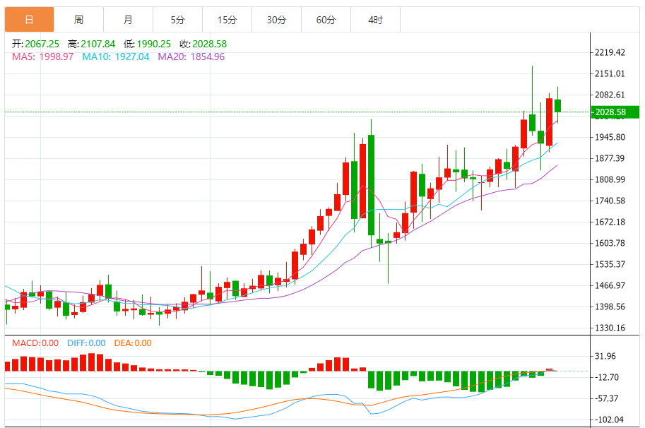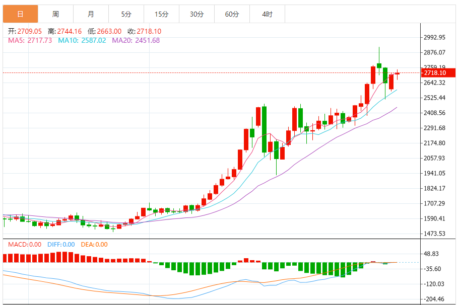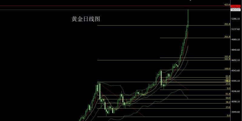 黄金市场昨日延续拉升趋势5179.5的位置后行情先回落,日线最低给到了5155.2的位置后行情强势拉升,给出5312附近后整理,回踩5332.5的位置后凌晨受到基本面影响强势拉升日线再创新高给出5419.5的位置后整理,日线最终收线在了5414.9的位置后日线以一根下影线很长的大阳线收线,而这样的形态收尾后,日线形态已