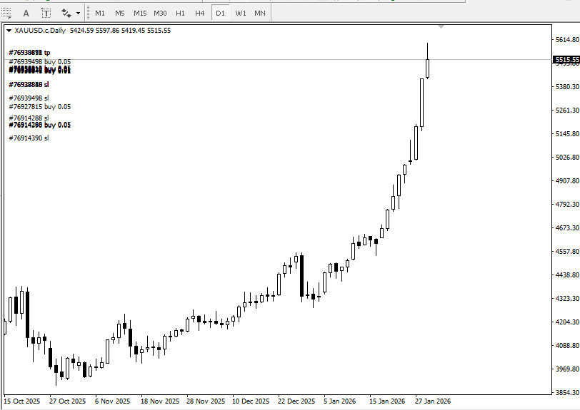 现在的黄金根本不看技术,不看经验,只看“勇气”。有没有敢于上车的勇气。 回头看看以前的上涨都是小弟,转眼金价5600美元了,每一天都像坐火箭一样。 1月美联储没有降息,维持原有利率不变,这不是重点,重点是市场已经完全忽视了任何利空,只要调整就是为了更大幅度的上涨。