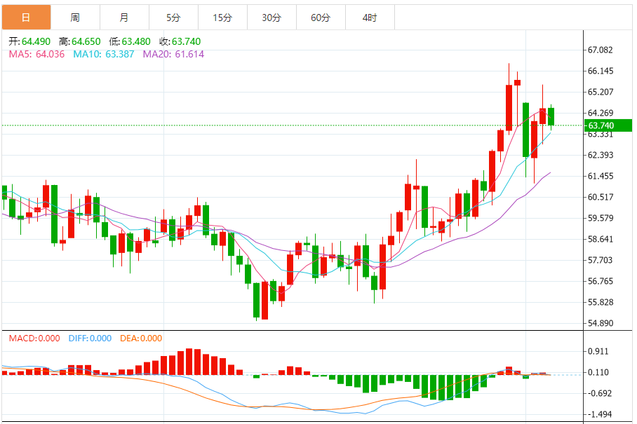 基本消息面 周四(2月5日),美原油价格交投于64.480美元/桶附近,跌幅为1.00%。 相关新闻消息 技术面来看,4小时级别原油震荡反弹,重回48日多空分界线附近,ACD双线与量能柱在零轴下方形成金叉,多头动能逐步释放。日线级别,油价站稳20日均线,布林带收口走平,价格运行