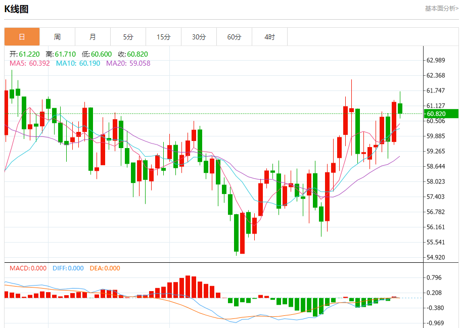 周一盘中,WTI原油报60.770,跌幅0.49%。 今日分析:在60.70之上,看涨,目标价位为61.70,然后为62.20。 技术点评:随后的阻力位是61.70,然后为62.20。 支撑位:60.7060.3560.00 阻力位:62.6062.2061.70 (亚汇网编辑:冰凡)