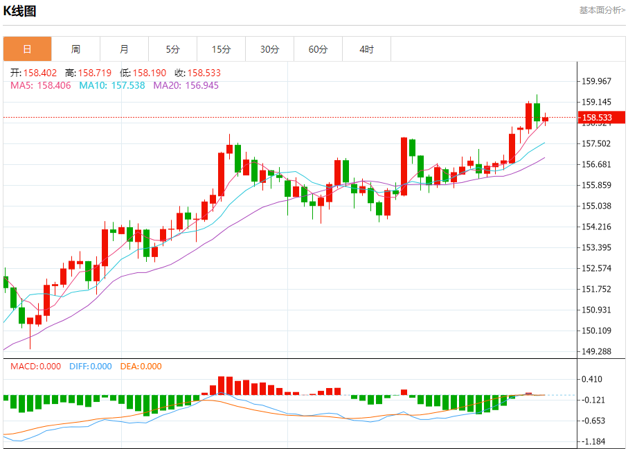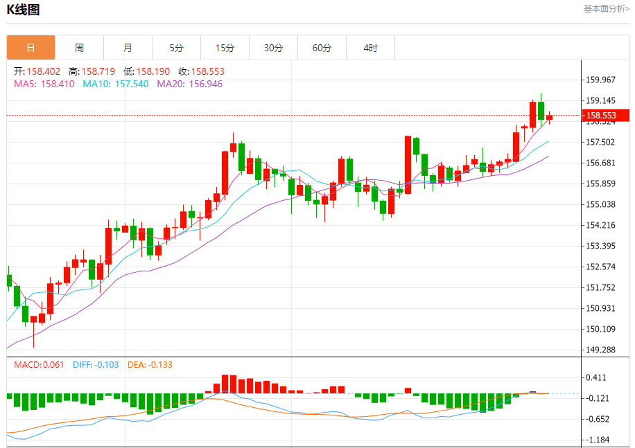 周四盘中,美元/日元报158.579,涨幅0.12%。 今日分析:在158.05之上,看涨,目标价位为158.90,然后为159.20。 技术点评:RI技术指标运行趋势复杂,倾向于上涨。 支撑位:158.05157.80157.50 阻力位:159.45159.20158.90 (亚汇网编辑:冰凡)