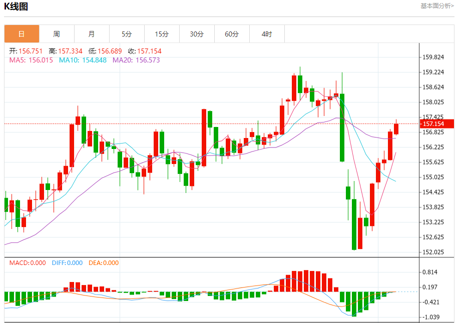 周四盘中,美元/日元报157.078,涨幅0.15%。 今日分析:在156.80之上,看涨,目标价位为157.70,然后为158.00。 技术点评:即使我们不能排除持续调整的可能性,其时间长度上,应该是有限的。 支撑位:156.80156.35155.95 阻力位:158.40158.00157.70