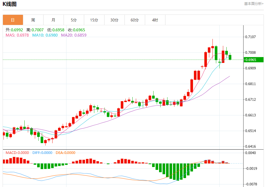 今日周四,澳元兑美元报0.6966,跌幅0.44%;美元兑加元报1.3693,涨幅0.22%;美元兑瑞郎报0.7765,跌幅0.11%。 澳元兑美元汇率分析 技术点评:只要依旧存在0.7010阻力位,很可能下跌至0.6935。 阻力位:0.70500.70300.7010 支撑位:0.69350.69100.6890