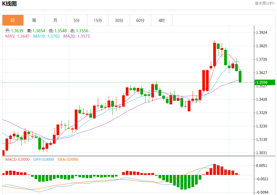 周四盘中,英镑/美元报1.3566,跌幅0.55%。 今日分析:在1.3625之下,看跌,目标价位为1.3535,然后为1.3490。 技术点评:只要1.3625阻力位不被突破,向下跌破1.3535位置的风险很高。 支撑位:1.35351.34901.3460 阻力位:1.37301.36751.3625 (亚