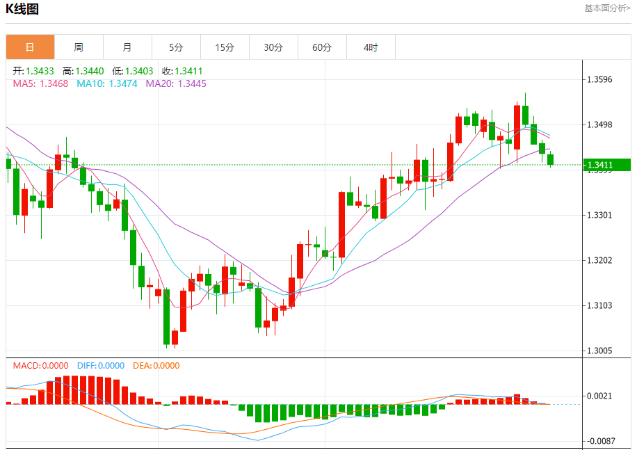 周五盘中,英镑/美元报1.3412,跌幅0.17%。 今日分析:在1.3450之下,看跌,目标价位为1.3385,然后为1.3355。 技术点评:只要依旧存在1.3450阻力位,价格波动存在看跌的趋势。 支撑位:1.33851.33551.3320 阻力位:1.34851.34651.3450 (亚汇网编
