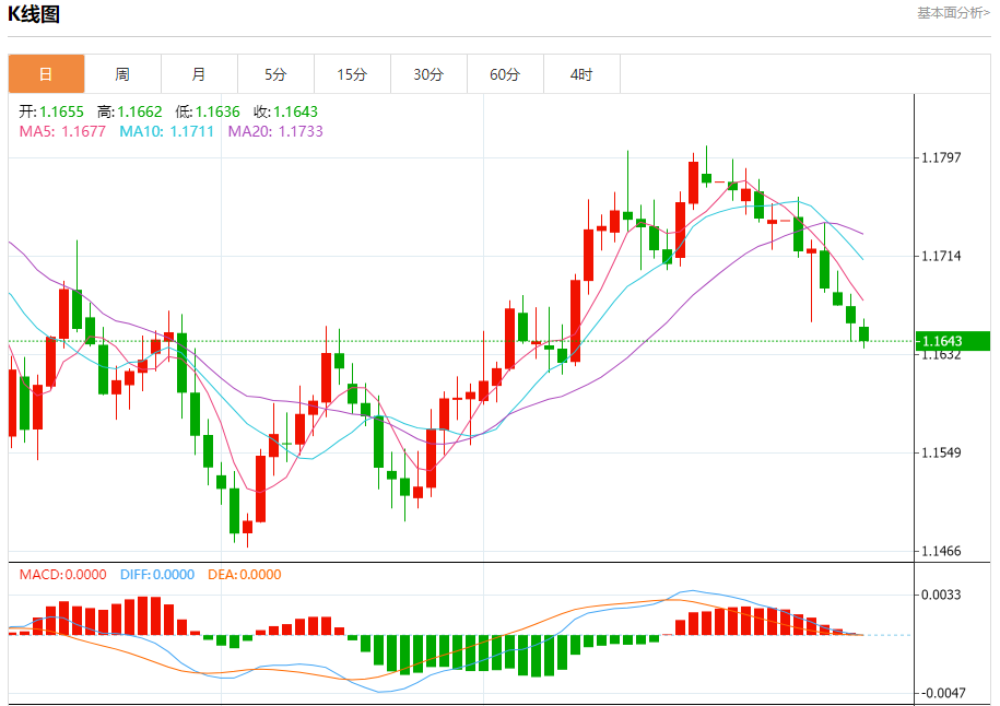 今日周五,欧元兑美元报1.1643,跌幅0.13%;英镑兑美元报1.3410,跌幅0.19%;美元兑日元报157.629,涨幅0.49%。 欧元兑美元汇率分析 技术点评:只要依旧存在1.1665阻力位,很可能下跌至1.1630。 阻力位:1.17001.16851.1665 支撑位:1.16301.16151.1590