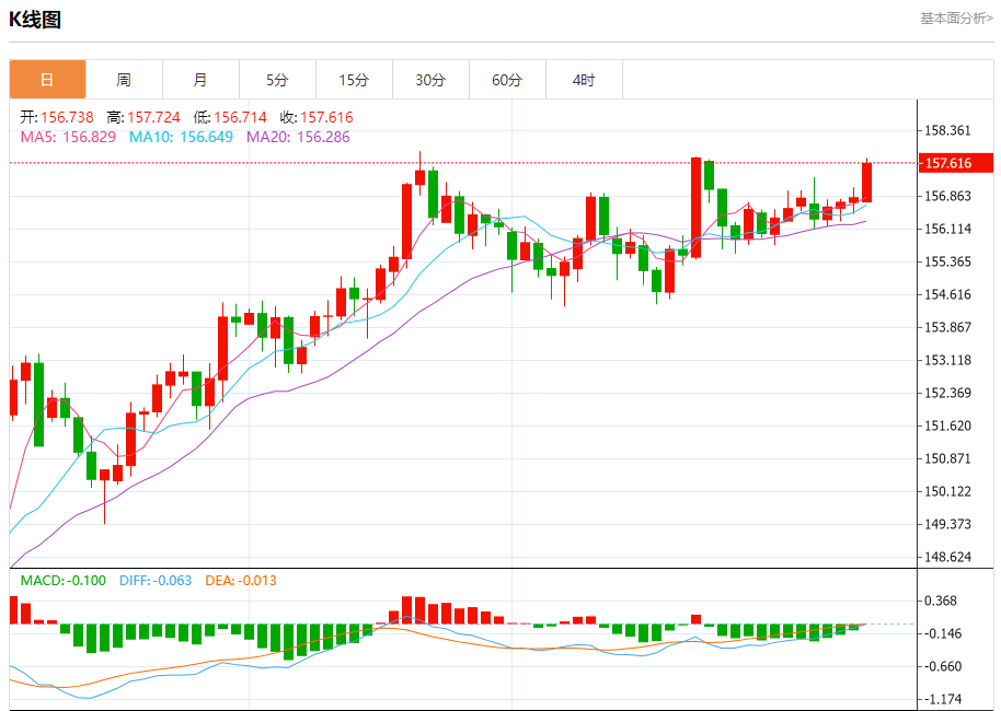 周五盘中,美元/日元报157.641,涨幅0.52%。 今日分析:在157.20之上,看涨,目标价位为158.05,然后为158.35。 技术点评:即使我们不能排除持续调整的可能性,其时间长度上,应该是有限的。 支撑位:157.20156.80156.50 阻力位:158.50158.35158.05