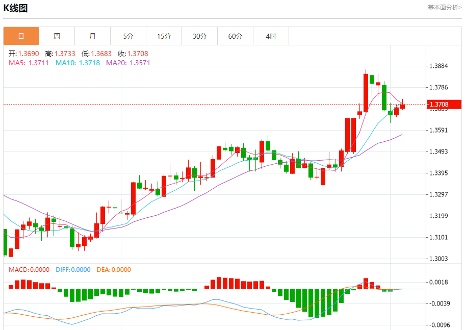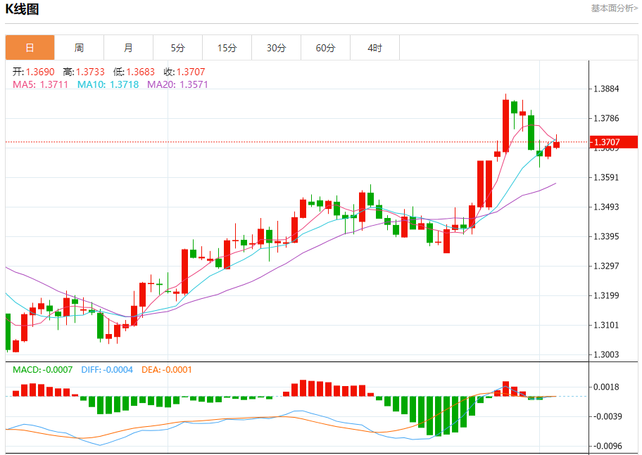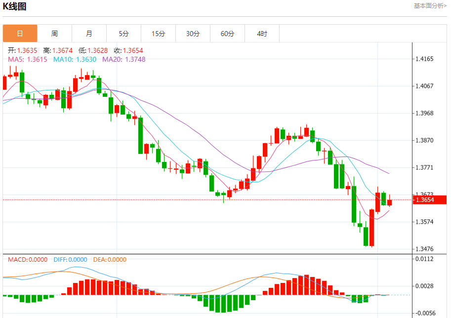 周三盘中,英镑/美元报1.3715,涨幅0.15%。 今日分析:在1.3735之下,看跌,目标价位为1.3680,然后为1.3650。 技术点评:只要依旧存在1.3735阻力位,价格波动存在看跌的趋势。 支撑位:1.36801.36501.3620 阻力位:1.37801.37501.3735 (亚汇网编
