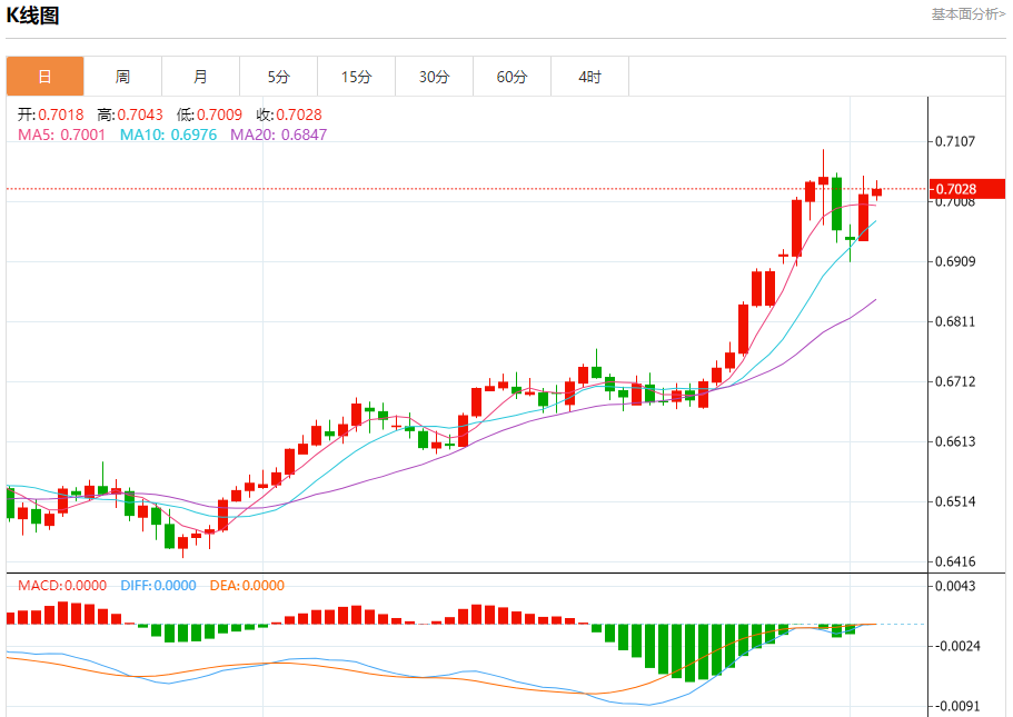 今日周三,澳元兑美元报0.7029,涨幅0.12%;美元兑加元报1.3654,涨幅0.12%;美元兑瑞郎报0.7758,涨幅0.17%。 澳元兑美元汇率分析 技术点评:超短线(当日内)技术指标运行趋势复杂,应谨慎操作。 阻力位:0.70900.70700.7050 支撑位:0.69900.697