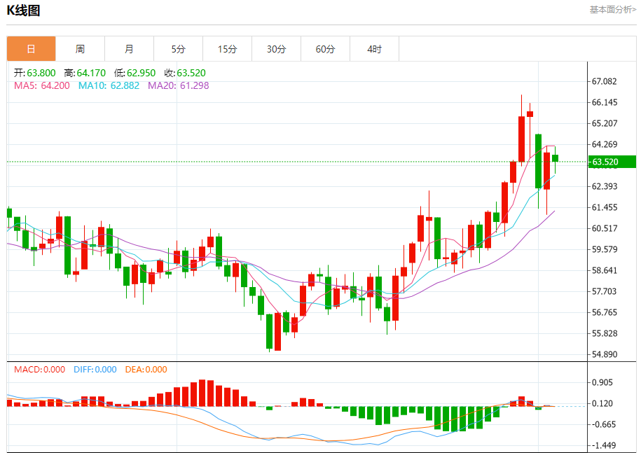 周三盘中,WTI原油报63.490,涨幅0.44%。 今日分析:在62.90之上,看涨,目标价位为64.20,然后为64.90。 技术点评:超短线(当日内)技术指标缺乏动能 支撑位:62.9062.1061.10 阻力位:65.9064.9064.20 (亚汇网编辑:冰凡)