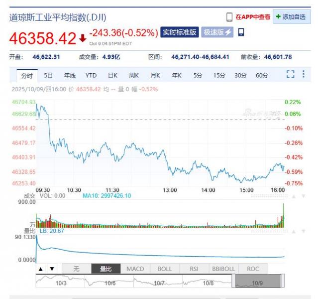 2025年10月10日星期五,以下是由亚汇网整理的昨夜今晨国际财经要闻汇总: 国际股市 一、美股股市:道指跌243.36点,跌幅为0.52%,报46358.42点;纳指跌18.75点,跌幅为0.08%,报23024.63点;标普500指数跌18.61点,跌幅为0.28%,报6735.11点。英伟达(VDA.U)涨近2%,谷歌(GOOG.U)、
