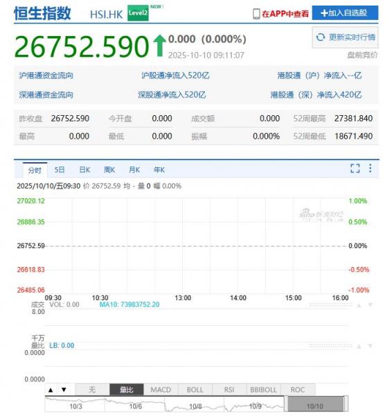 港股收盘行情: 香港恒生指数10月9日(周四)收盘下跌76.87点,跌幅0.29%,报26752.59点; 香港恒生科技指数10月9日(周四)收盘下跌42.85点,跌幅0.66%,报6471.34点; 国企指数10月9日(周四)收盘上涨6.26点,涨幅0.07%,报9530.13点; 红筹指数