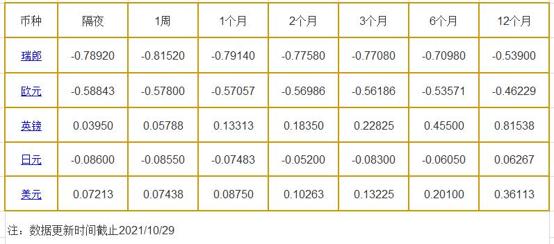 10月29日伦敦银行同业拆借利率: 隔夜LIOR:瑞郎报-0.78920%,欧元报-0.58843%,英镑报0.03950%,日元报-0.08600%,美元报0.07213%; 1周LIOR:瑞郎报-0.81520%,欧元报-0.57800%,英镑报0.05788%,日元报-0.08550%,美元报0.07438%; 1个月LIOR:瑞郎报-0.79140%,欧元报-0.57057%,英镑报0.13