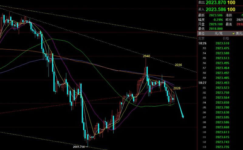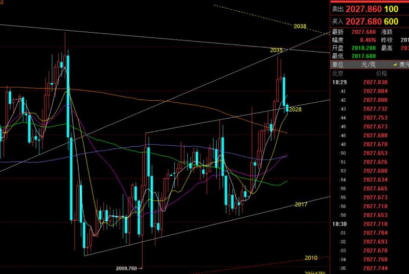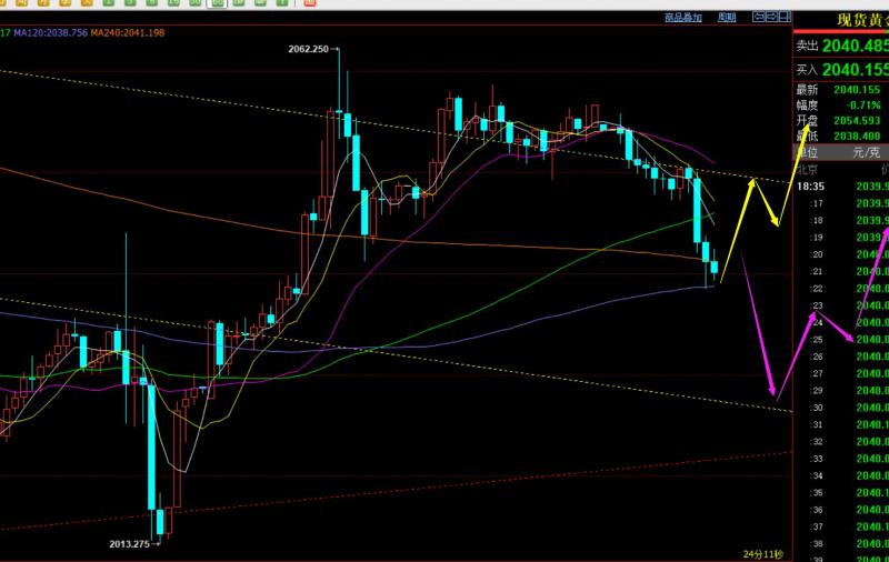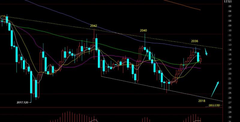 郑氏点银:黄金短期仍处于下跌调整状态,原油反复拉低看涨 回顾上周五行情走势及出现的技术点: 第一,黄金方面:上周五亚欧盘是一路震荡慢涨走高,当2023通道反压点无法阻挡时,就认为下一个承压点要关注2040一线,它是处于2062-2002反抽618分割阻力,也是2062-2058前高趋