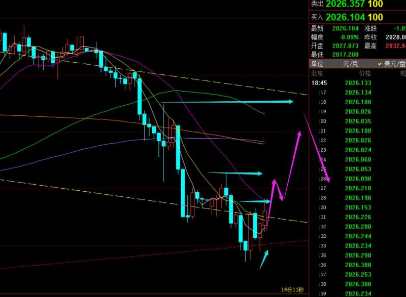 郑氏点银:黄金即将结束下跌调整转趋势上攻,原油中期也或发力 回顾昨日行情走势及出现的技术点: 第一,黄金方面:昨日依旧是震荡,围绕2040-2020之间,不过它来回过山车相对周初更加激烈,先2020上涨至2041,刺破前一日高点,再冲高回落至2015,刺破2018-17关键趋势支撑线