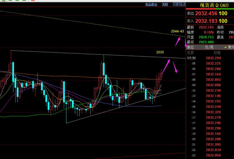 郑氏点银:美元若失守103关口或助推金价拉升,原油继续看涨 回顾昨日行情走势及出现的技术点: 第一,黄金方面:昨日亚盘出现急速连阳走高,突破2032前一日高点,有所打破前两日的震荡慢下滑通道,但很快欧盘冲高回落,打回原点,这说明金价仍处于无厘头震荡扫荡之中;