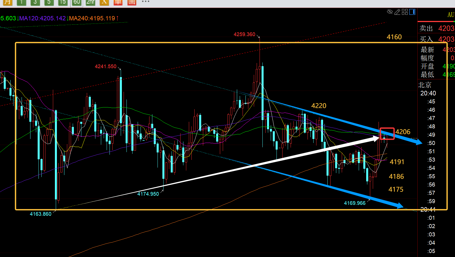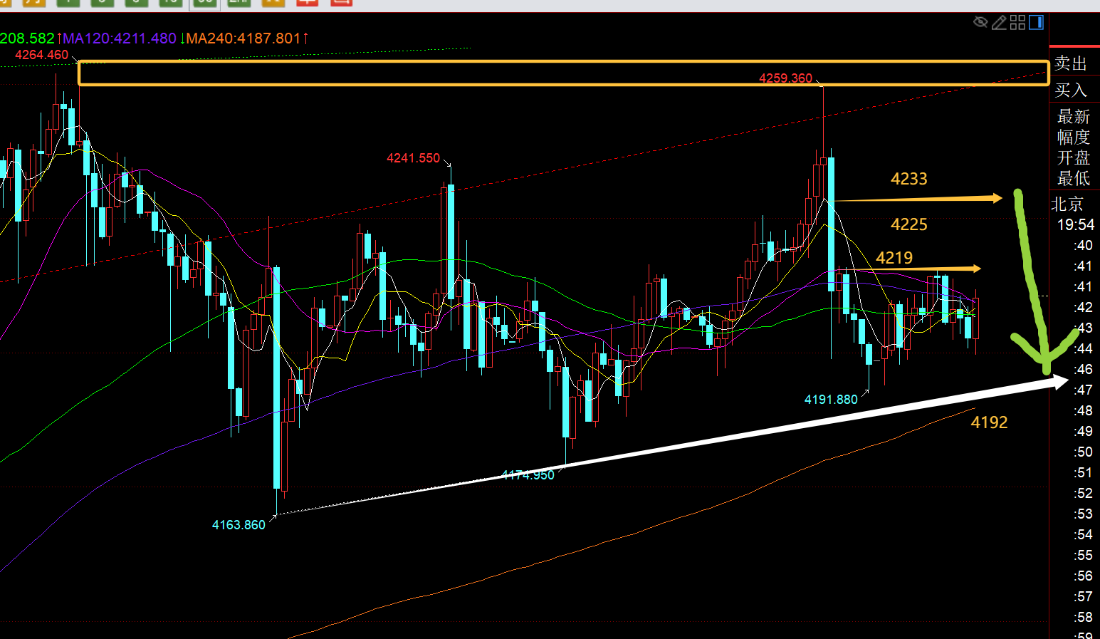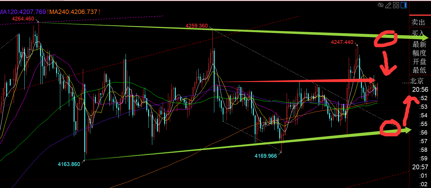 郑氏点银:黄金欧盘震荡V拉升破高,今晚回踩还有二次拉升概率 回顾昨日行情走势及出现的技术点: 第一,黄金方面:上周五隔夜冲高持续打压走低,昨日早间先反弹,则需先看跌,依托凌晨阻力位4219下,也是382分割承压点,只是昨日走的是在太磨叽,跌至4200来回折腾了