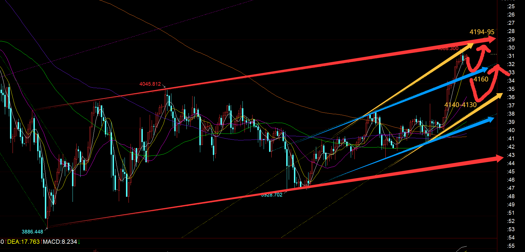 郑氏点银:黄金强势续涨,今晚4124作为节点稳住则继续上涨 回顾昨日行情走势及出现的技术点: 第一,黄金方面:昨日一整天都在持续逼空强拉,周末就计划一早触及3990上先继续看涨,但开盘4000左右就直接飙升;欧盘计划4060上看涨,只给到4071;美盘计划4065上看涨,只给到4074,全