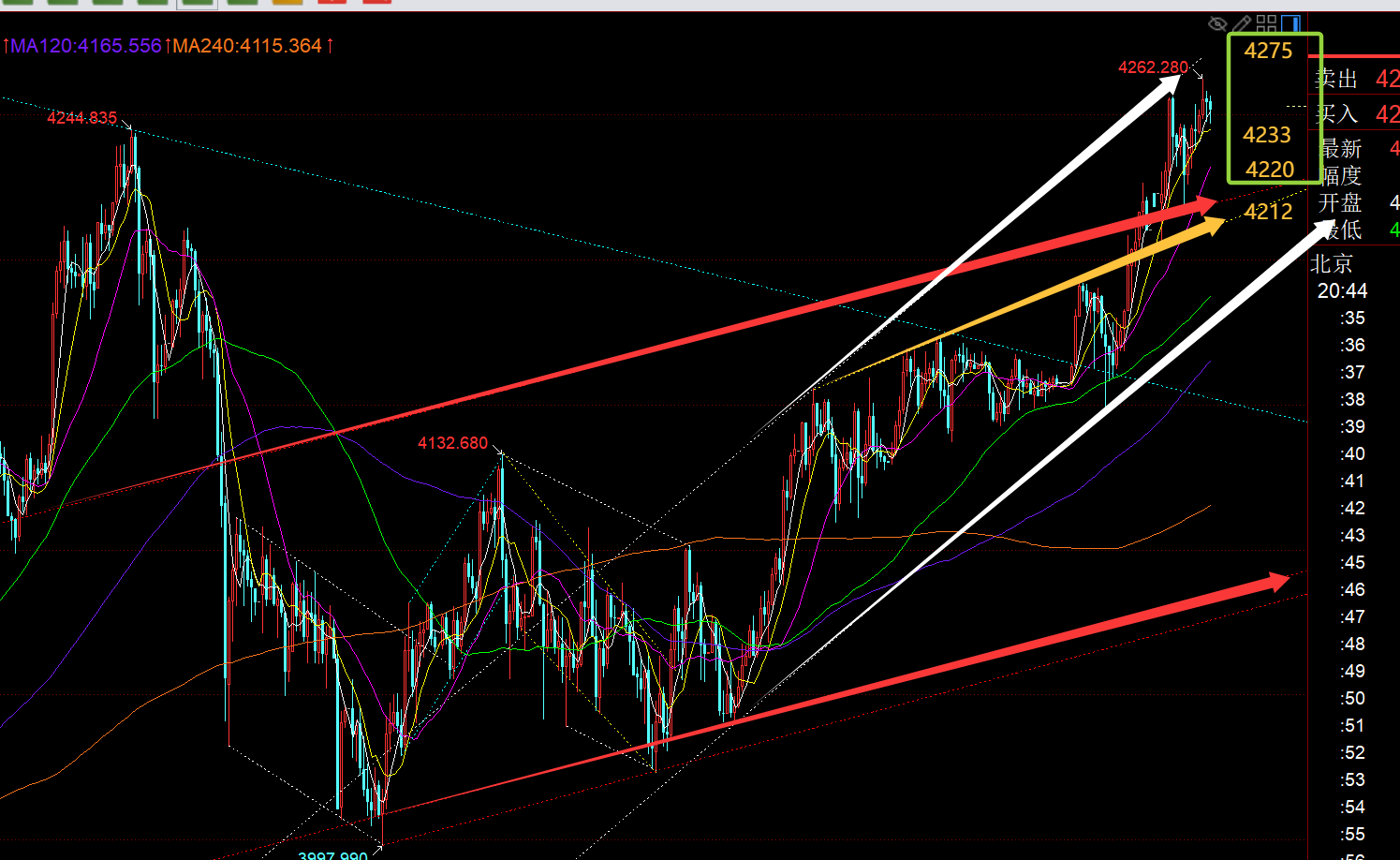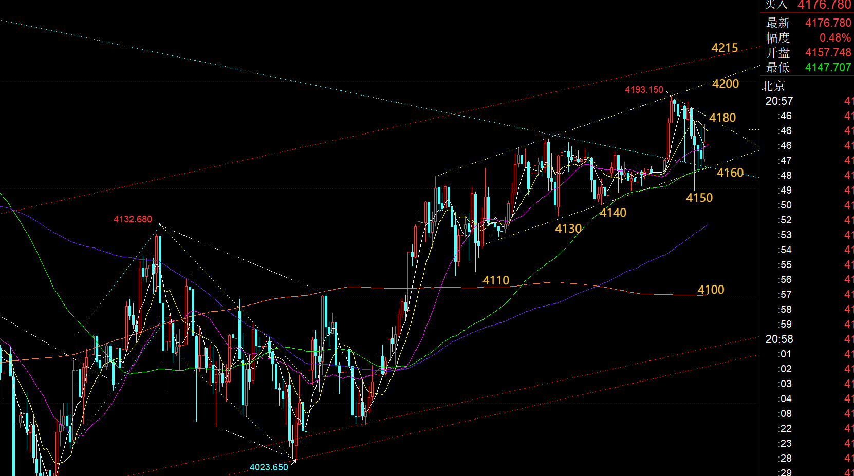 郑氏点银:黄金4192直接越过,次高点延续至下一个4275 回顾昨日行情走势及出现的技术点: 第一,黄金方面:昨日早间冲高回落,大阴失守小时线10日,则代表逼空结束,展开回调震荡修正,则4121跟随一波看跌下行,最低触及4098逢低拿下;由于当时连阴走的形态可
