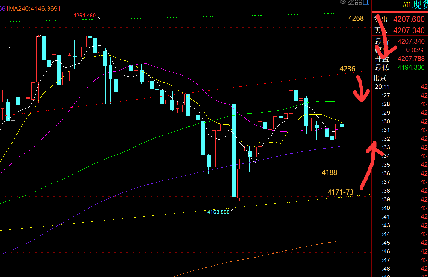 郑氏点银:黄金震荡慢跌失守4200,今晚先看二次打压 回顾昨日行情走势及出现的技术点: 第一,黄金方面:昨日差点被多空杀,节奏没把握好,主要是出现两个问题,可能是大部分人都会犯的:①,当短线有了利润,比如昨日4238震荡看涨,最高拉升4247,有了9米利润后,没