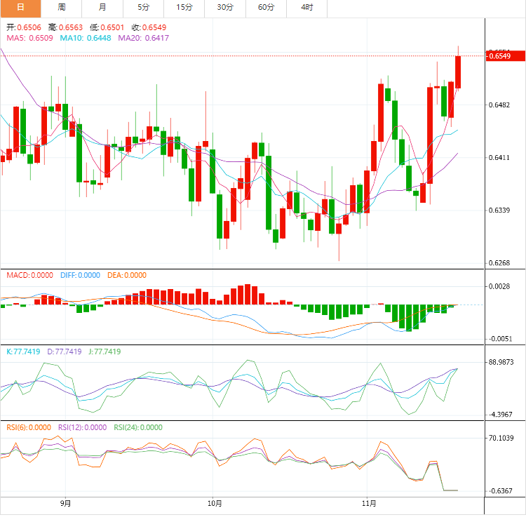 周一盘中,澳元兑美元上涨至0.6550,涨幅0.54%。 基本面上,在中国公布利率决定后,澳元(AUD)获得上行支撑。中国人民银行将贷款优惠利率(LR)维持在预期的3.45%不变。然而,由于美元试图从上周五创下的两个月低点反弹,澳元兑美元汇率面临挑战。 技术面上,在A50形成对价格的良好支撑之后,澳元兑美元明显反弹,
