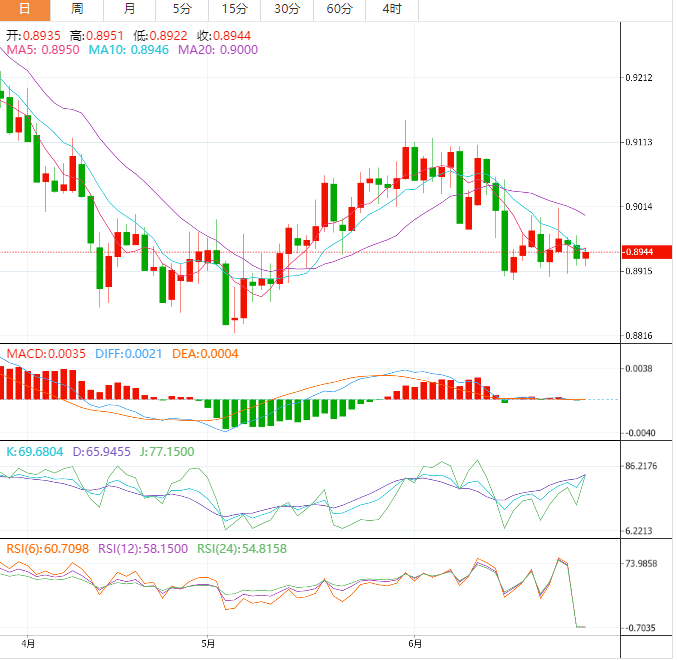 周三盘中,美元兑瑞郎上涨至0.8945,涨幅0.10%。 基本面上,美元兑瑞郎小幅上涨至0.8945附近,整理本周跌势,结束两连跌。该货币对印证交易员对美元的青睐,同时市场情绪谨慎,美联储押注偏鹰派。展望未来,瑞士6月ZW调查和瑞士央行的季度报告将指引美元/瑞郎短期波动,然后为美联储主席鲍威尔的讲话。 技术面上