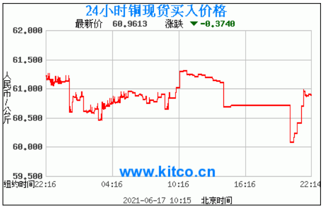 铜价格走势图今日最新铜价行情(2021年6月17日) 今日最新铜价:60.9613涨跌:-0.3740 备注:以上铜价格仅供参考,请以官方价格为准。