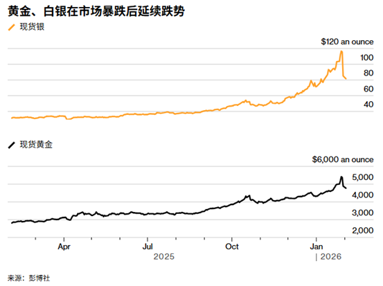 ATFX:黄金暴跌至5000附近,白银考验100支撑 ATFX:没有只涨不跌的行情。1月份黄金延续疯牛趋势,昨日最高触及5597美元,刷新历史纪录。空头开始发力,黄金当日收盘至5370附近。今日亚盘和欧盘,空头动能延续,多头开始大溃败,盘中最低价已经达到5057美元,距离5000美元关口仅一步之遥。 白银跟随黄金波动,经过昨日