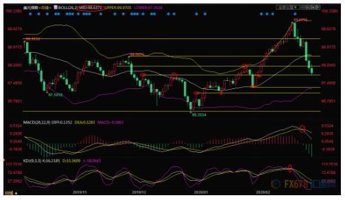 由于100日和200日均线的支撑也比较强,短线也需要警惕温和反弹的可能性,初步阻力在98整数关口附近,上周四低点阻力在98.35附近,顶破该阻力前,后市仍偏向空头;布林线中轨阻力在98.63附近,若意外顶破该阻力,则削弱后市看涨信号。
