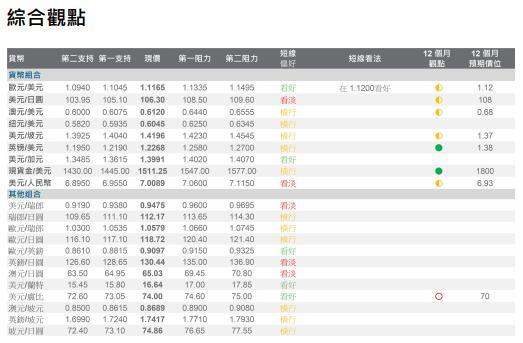 澳元及纽元在全球增长忧虑及国内大幅减息下显著走低,现时短期技术指标呈现极端状态,意味有可能出现反弹。如果澳元兑美元能够守住0.60区间,我们预计汇价将反弹至0.6440 - 0.6650。纽元兑美元可能已经在0.5935建立近期低位,如果汇价能守住有关水平,将有望短线向0.6250 - 0.6450反弹。金价短线或会在关键的1450美元支持位见到短期低位,而我们亦预计金价有机会向1550 - 1575美元反弹。