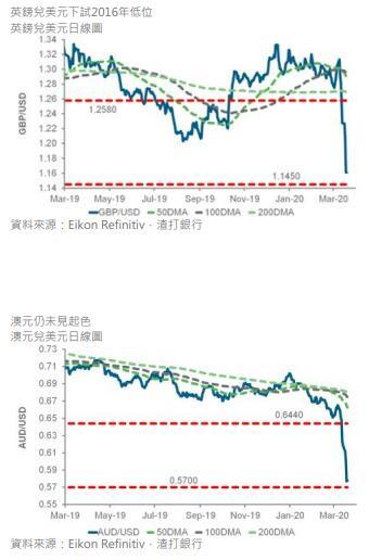 尽管主要中央银行努力提高流动性,但美元资金压力仍然存在,美元兑大多数货币亦因而飙升。风险资产暴跌,因为投资者出售部份避险资产套现。 欧元兑美元跌破关键支持位1.0940-50后跌势加速,可能因触发了一些止蚀指令。 该货币组合曾触及1.0800左右的低位才收复部份失地。 近期的大幅下跌令到测试2020年低位1.0778变成可能发展。 日圆仍保持一定弹性,在撰写本文时于108.30附近交易, 进一步走高的话可能会在109.60附近遇到阻力。