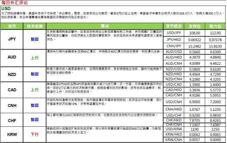 人,按周增加76.575 万人,至于持续申领失业救济人数为180.3 万人,按周增加10.1 万人。美国就业市场急速转弱,增加市场对特朗普政府将出台更多救市措施的憧憬。同时,亦使美元的