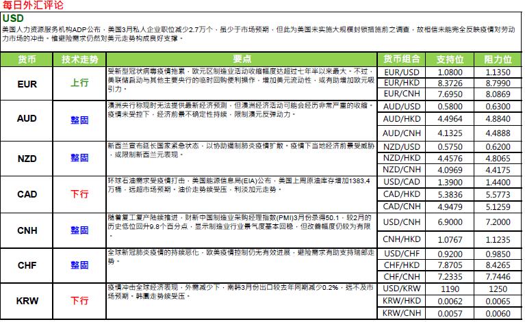 当市场正关注疫情对美国经济带来的冲击有多大之际,昨晚美国ADP 私人人力资源机构公布其3 月份调查报告,相信可为市场带来一定启示。据ADP 数字指,美国3 月份私人职位减少27,000 名,是自2017 年9 月以来首次出现下跌。相比之下,美国2 月份私人职位却增加了18.3 万名。现市场估计,于本周五官方公布的美国3 月份非农职位将减少10 万份。另外,美国坡士顿地区联储局长Eric Rosengren 指,要民众保持距离对抗疫情,难免会损害就业。他担心美国失业率将有机会大幅度攀升。至于美国总统特朗普昨晚亦发出警告,指未来两周将会相当艰难,是对抗疫情的重要时刻。上述因素使昨晚,美股道指大跌973 点或4.44%。资金转流向美债市场避险,美国10 年债息跌破0.6%,今早于亚洲市场见0.5676%。