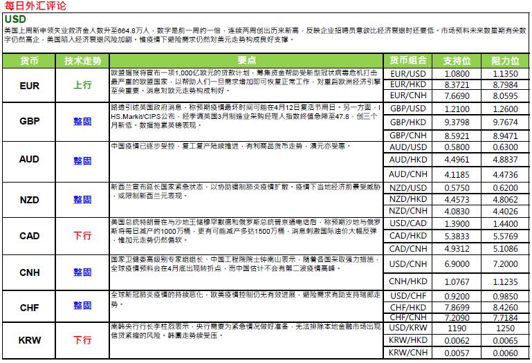 =607; 美国截至3 月28 日止当周,初领失业救济人数激增至664.8 万人,远高于市场预期的350 万人,且续创有纪录以来新高,前值为 328.3 万人。同期,四周初领失业救济平均值为261.2 万