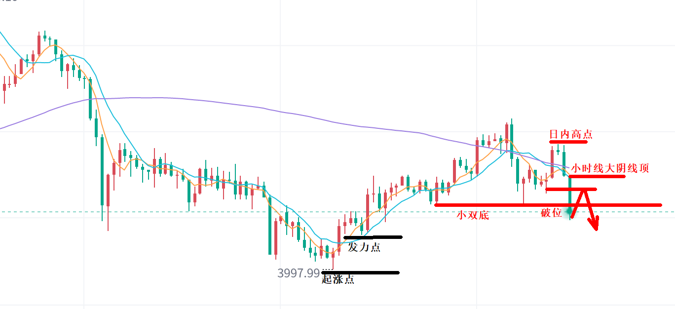 4,而价格一口气走破底,位置也难卡了。凌晨低点位置在40667-68一线,小时线大阴线位置在4082一线。这是日内短线可空的两个点。