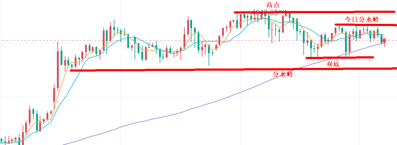 强势上升中,日线转阴是买入点,但现在高位震荡,两个分水岭很明确,上方4643测试了多次,下方4570,昨日又是4580测试了三次。