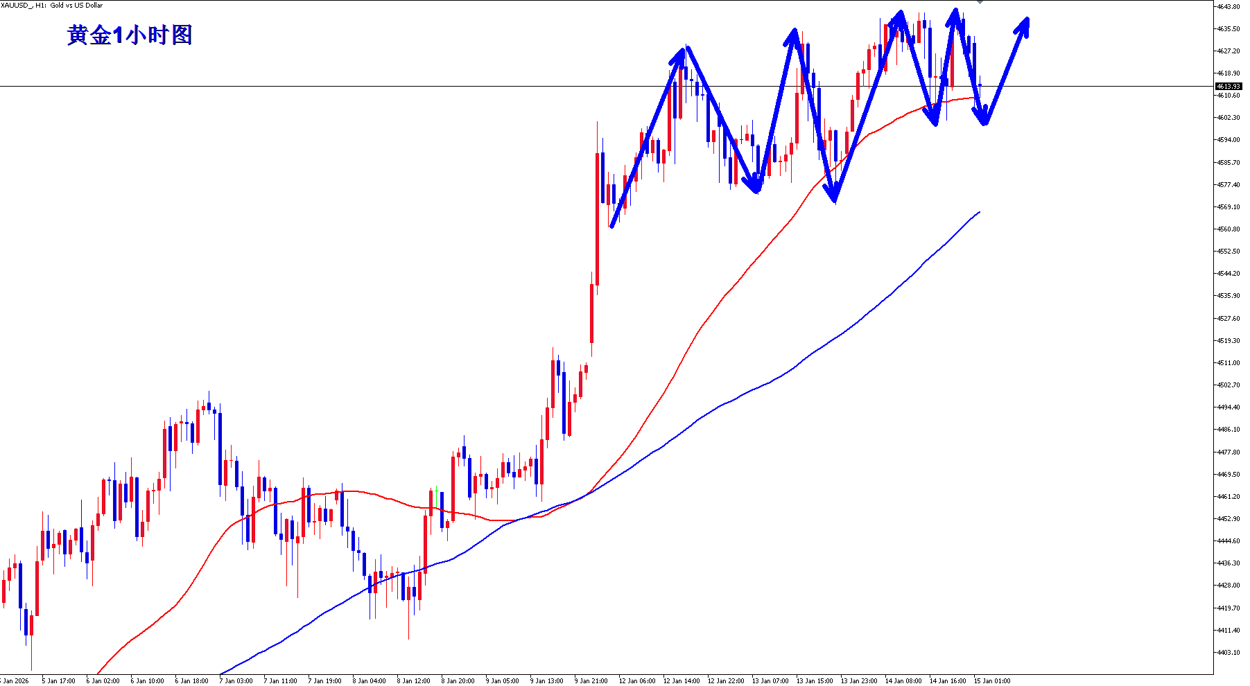 黄金整体还是多头行情,黄金1小时现在是震荡上行的节奏,黄金短期有所回落,不过多头始终坚守4600一线,黄金多头继续继续在4600一线上方运行,那么黄金短期不破4600,那么黄金就还是强势的蓄势行情,蓄势之后黄金有望继续创历史新高。