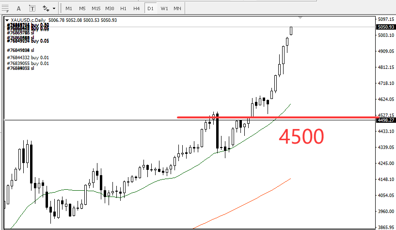日线六连阳,价格冲到5046!像脱缰的野马,甩开均线,直冲5100!