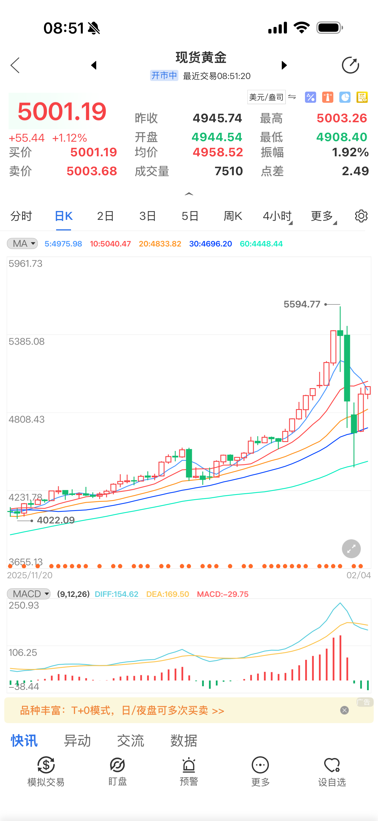 现货黄金近期剧烈波动,从前期最高点5594.77美元/盎司,下探至2月2日的最低点4403.64美元/盎司,最大跌幅约21.3%。随后开启强劲反弹,截至2月4日上午,现货黄金报5001.29美元/盎司,日内涨幅1.12%,较最低点反弹幅度约13.6%,成功站上5000美元关口。