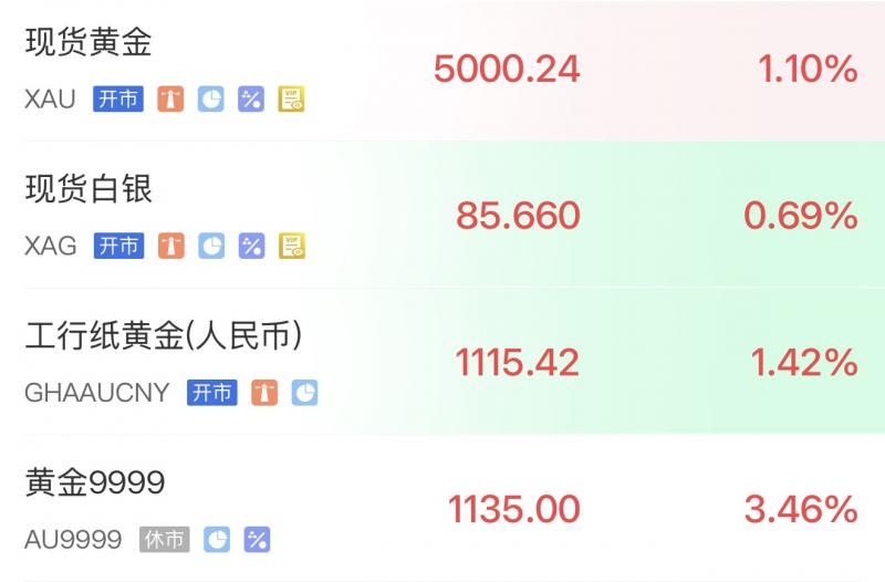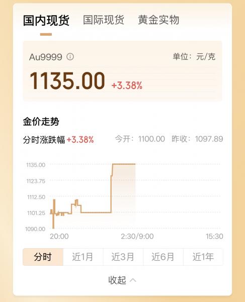 国内市场方面,工行纸黄金(人民币)报1115.42元/克,日内上涨1.42%;黄金9999报1135.00元/克,日内涨幅3.46%。