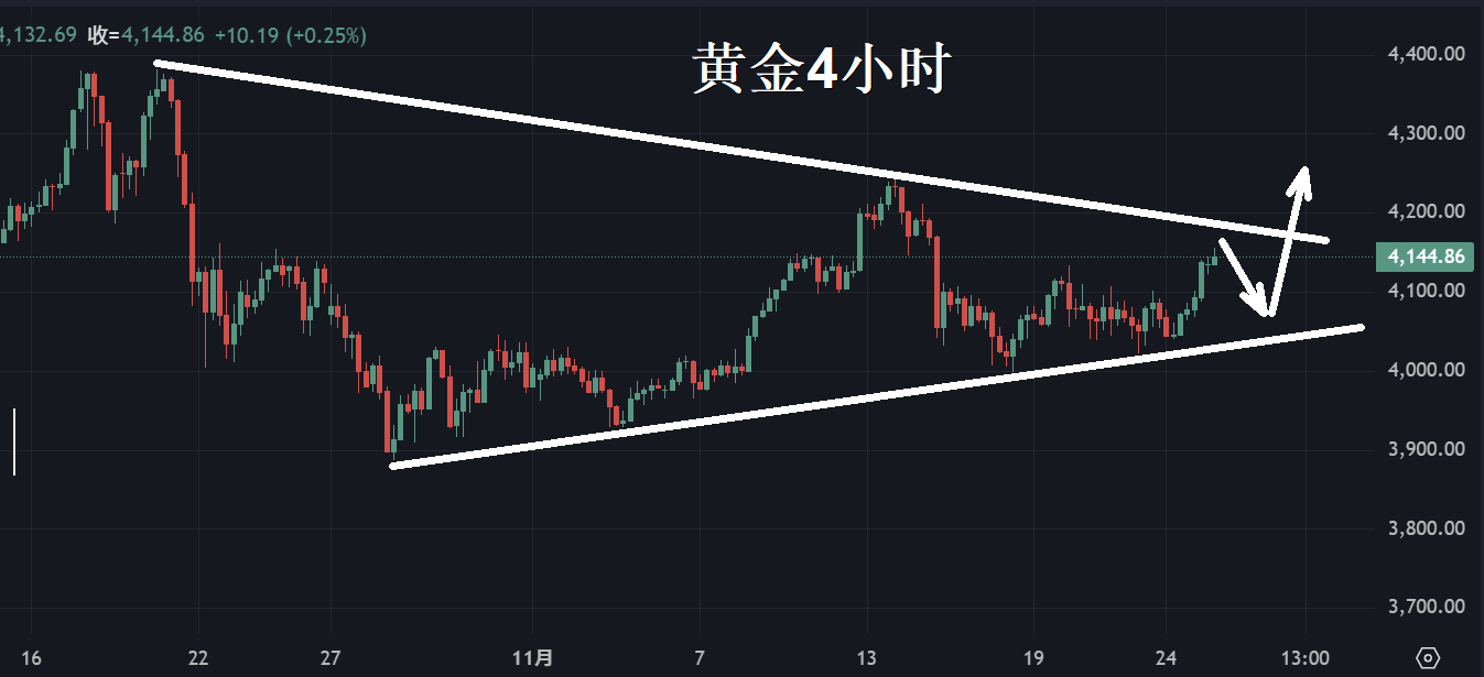 从K线结构来看,仍然处于大级别三角形震荡尾部,周一小范围突然后金价重回4100美元,而这里重回后是一路绿灯冲刺新高还是突然掉头向下?我更偏向于后者。