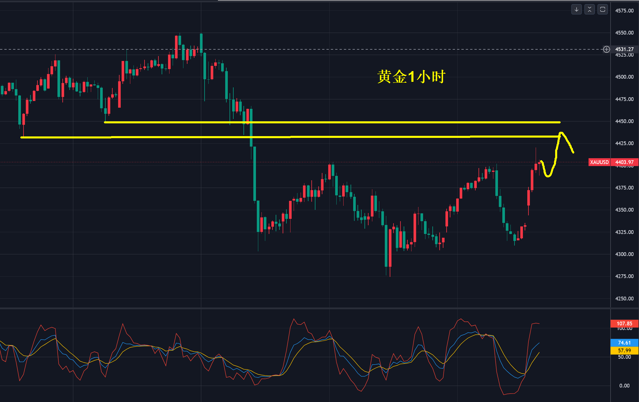 今天我认为可以先多黄金至4430-4445美元的范围内,靠近4400附近就能直接进场不用等深度回调,回调幅度越大说明上涨动力衰竭反而不能做多了,而在4430-45美元的范围内视情况再空,也就是先多后空的思路。