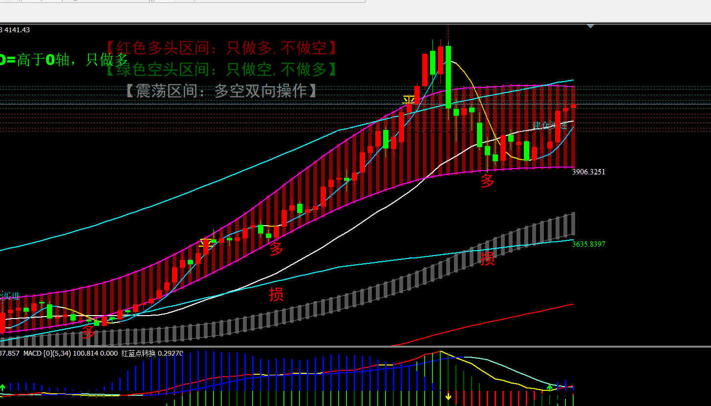 昨天黄金至欧盘弱多信号出现后,一直上涨,晚间两间在4100压制回落4087不破,再次上扬突破4103形成加速上行,最终以一根中阳收盘,从当下来看,短期突破了通道边线,后市延倬去H2的边线位,其次是日图上线及上轨区域,不过经过昨晚的强势上扬,早盘预期先行拉升一下后会走一个修正再次上涨,目前支撑4105和17区域,所以